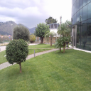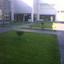 Rimozione del prato precedente, realizzazione di impianto di irrigazione con tecnologia di subirrigazione per evitare di rovinare con l'acqua calcarea le vetrate dell'ufficio, posa in opera di prato a rotoli.